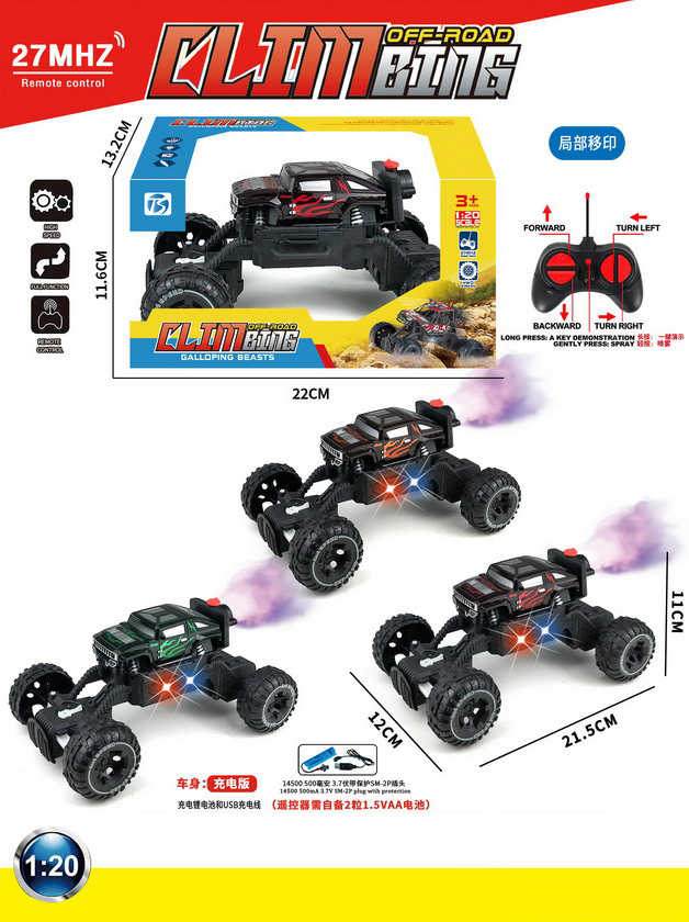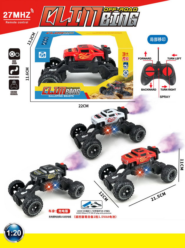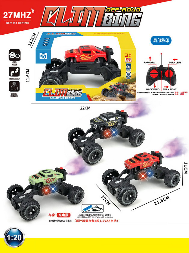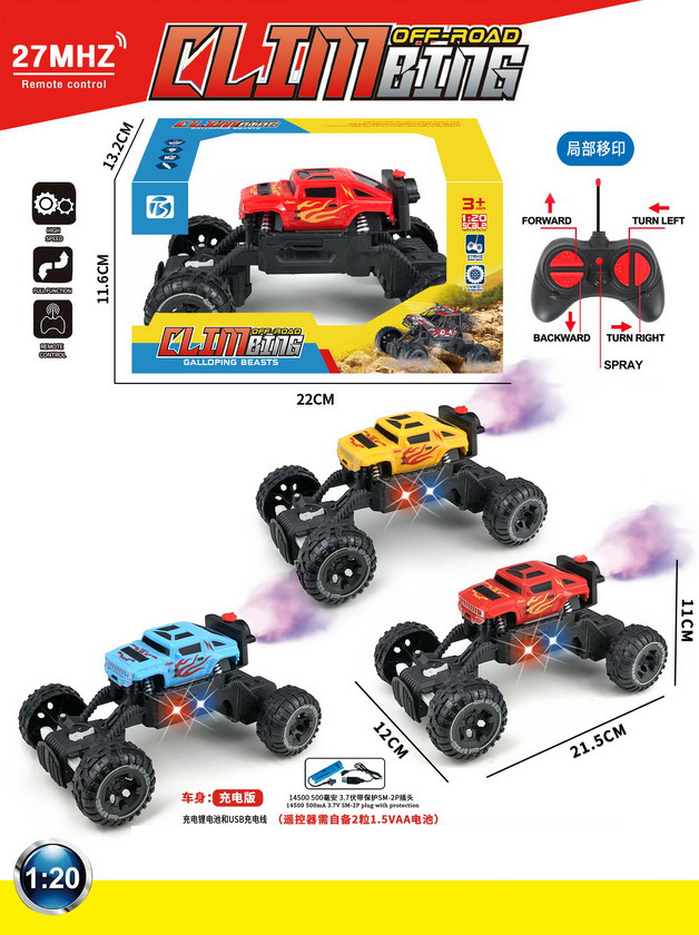 product_name: 6 FUNCTION R/C CAR W/LIGHT&SPRAY W/BATTERY&USB CHARGER(3 COLOUR ASST.)