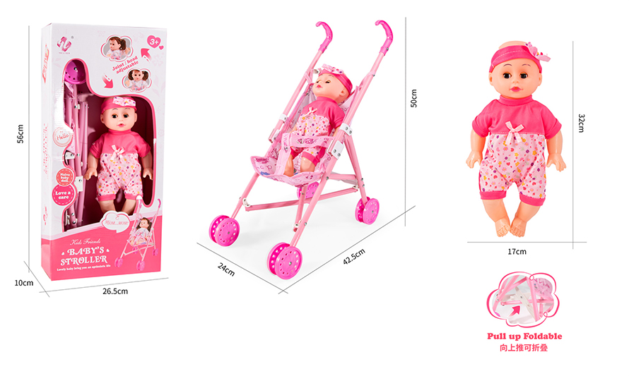 14"EMPTY BODY DOLL W/PLASTIC BABY CARRIAGE