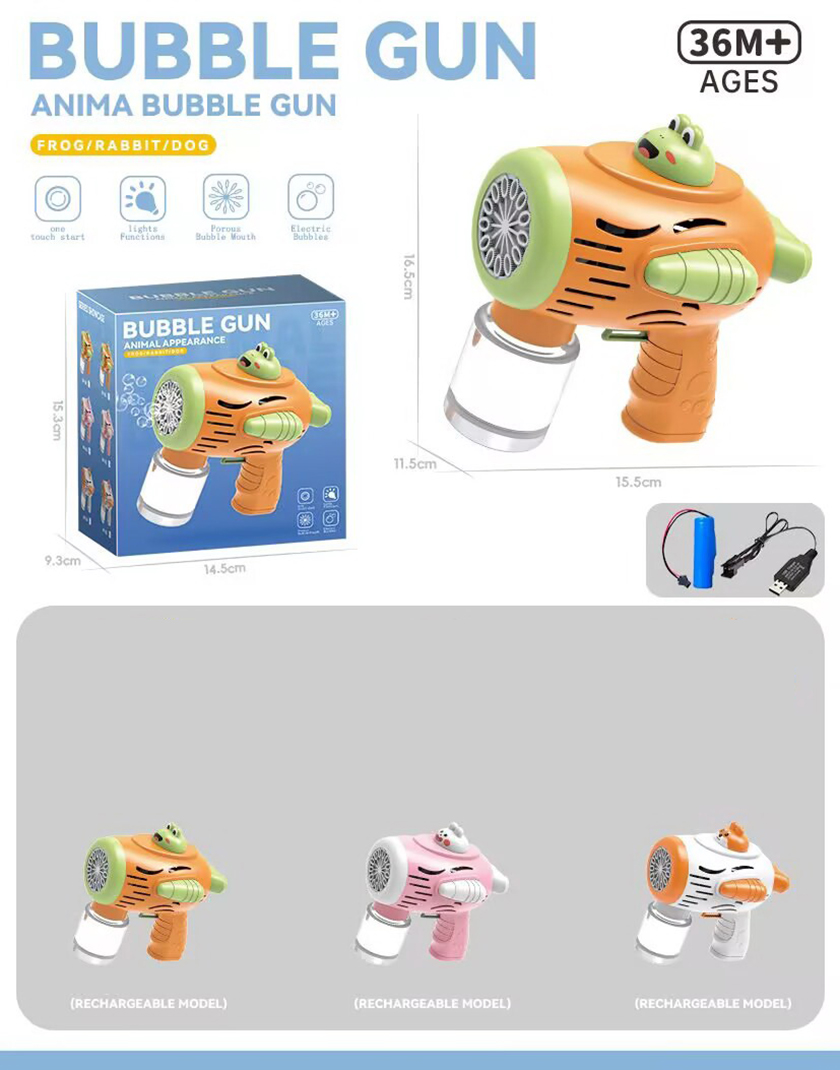 product_name: B/O BUBBLE GUN W/BATTERY&USB CHARGER(3 COLOUR ASST.)