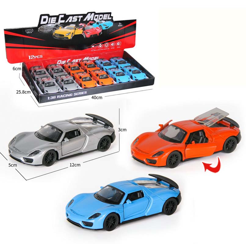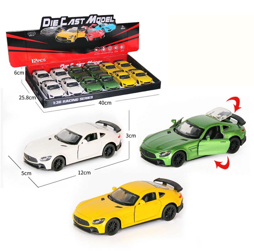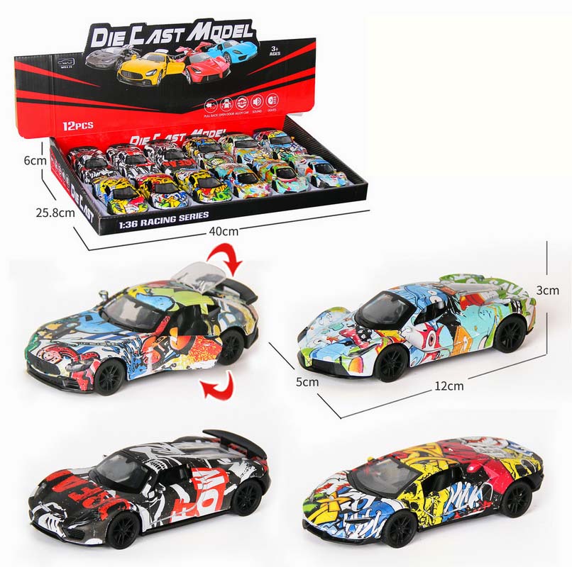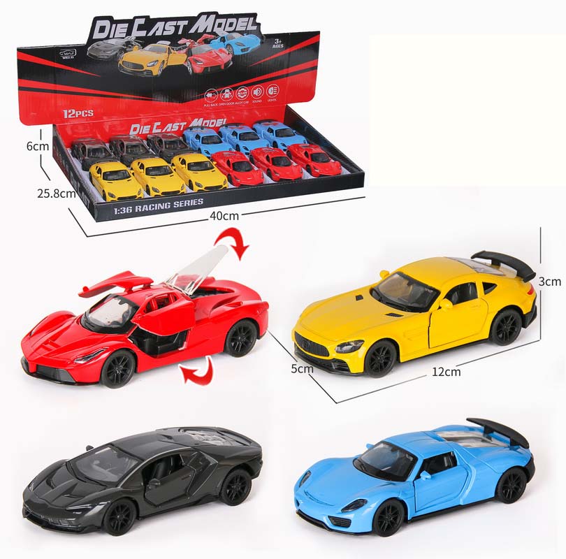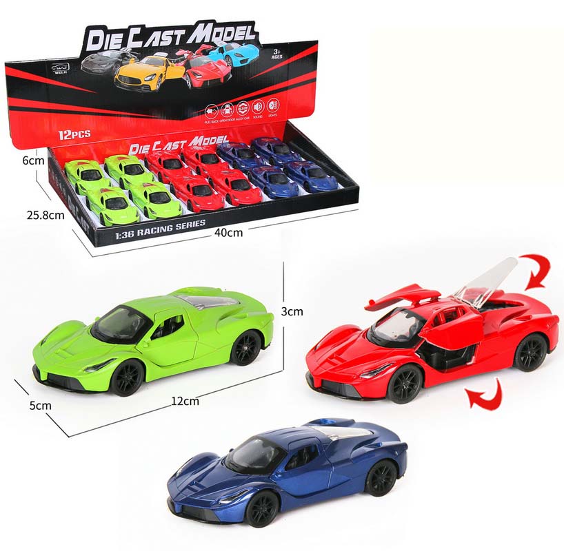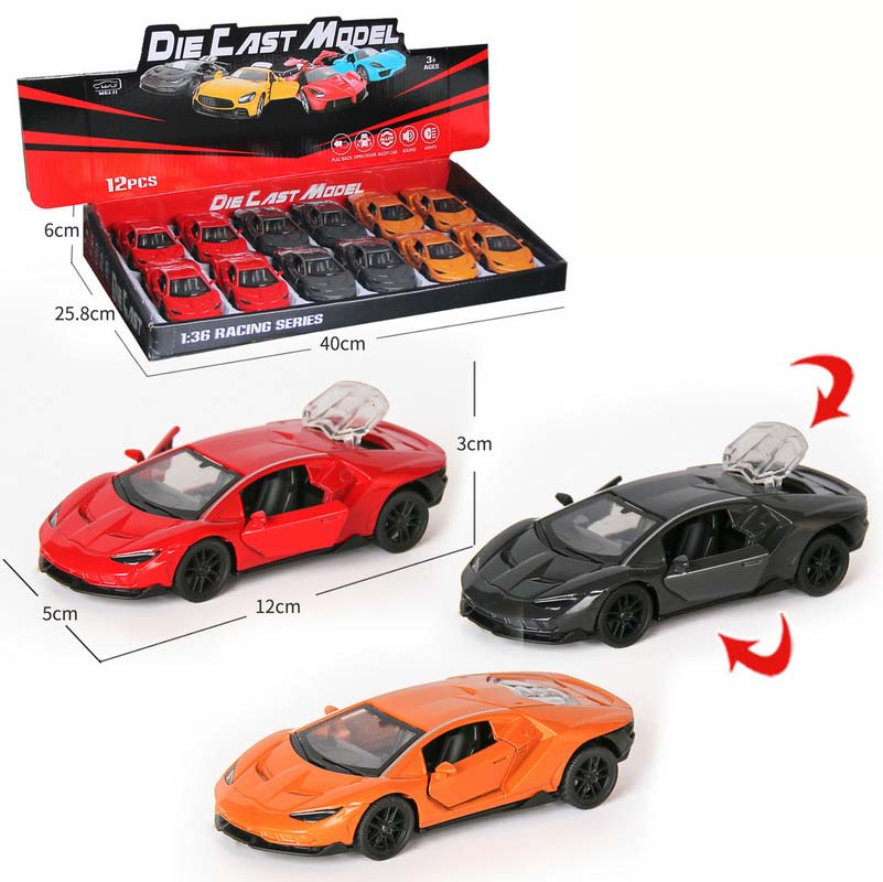 1:36 DIE-CAST PULL BACK CAR W/LIGHT&MUSIC&BUTTON BATTERY 12PCS(4 ASST.)