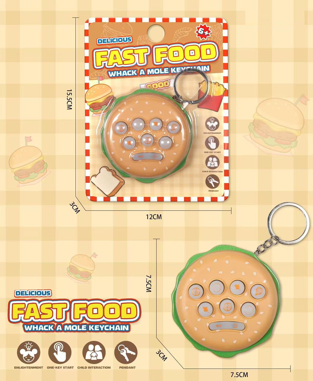 HAMBURGER WHACK A MOLE KEYCHAIN W/LIGHT&MUSIC&BUTTON BATTERY